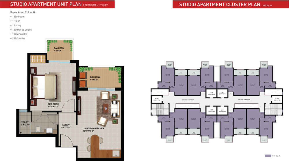 1 bhk + 1T | 615 Sq. ft. | 28,90,500 | View Plan |