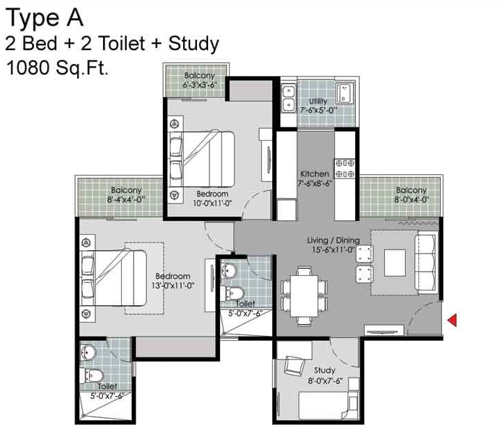 2BR+2T+Study | 1080 Sq-ft | 59,40,000 | View Plan |