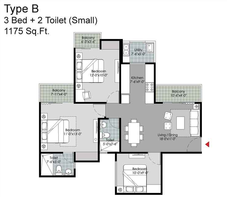 3BR+2T | 1175 Sq-Ft | 64,62,500 | View Plan |