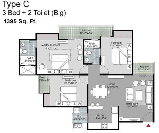 3BR+2T(Big) | 1395 Sq-Ft | 76,72,500 | View Plan |