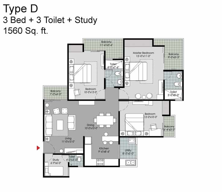 3BR+3T+Study | 1560 Sq-Ft | 85,80,000 | View Plan |
